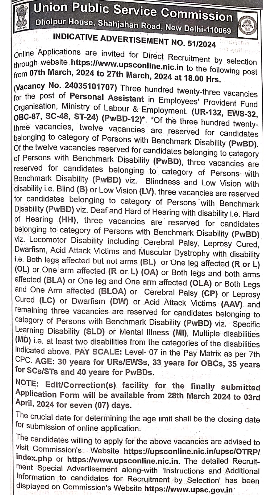 UPSC Personal Assistant 2024 Online Form